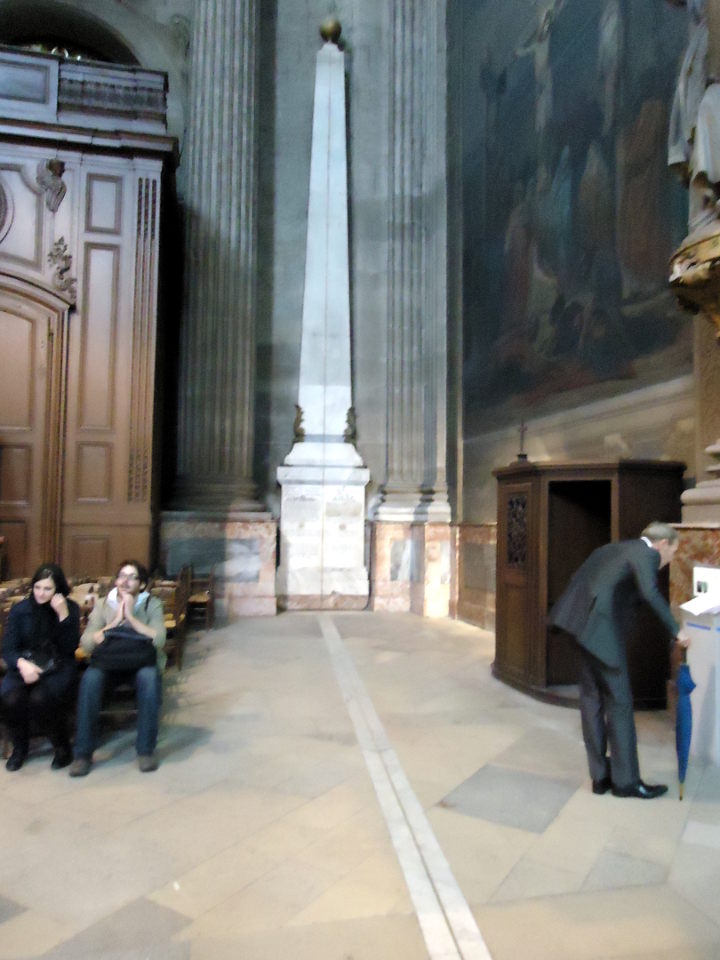 Sept 21, the next day, I wanted to go to the Church of Saint-Sulpice. As it followed the Rose line from Renne le Bains, where I had just been. So I went there, as it was also World Peace Day and I wanted to hold space for the recent passing of a friend Jenny (she had run a cafe in Edinburgh). The Paris Meridian is about 100 metres east of the gnomon in the church. The gnomon, (which is the part of a sundial which casts a shadow) with a strand of brass wire incrusted on it, which represents the meridian line.