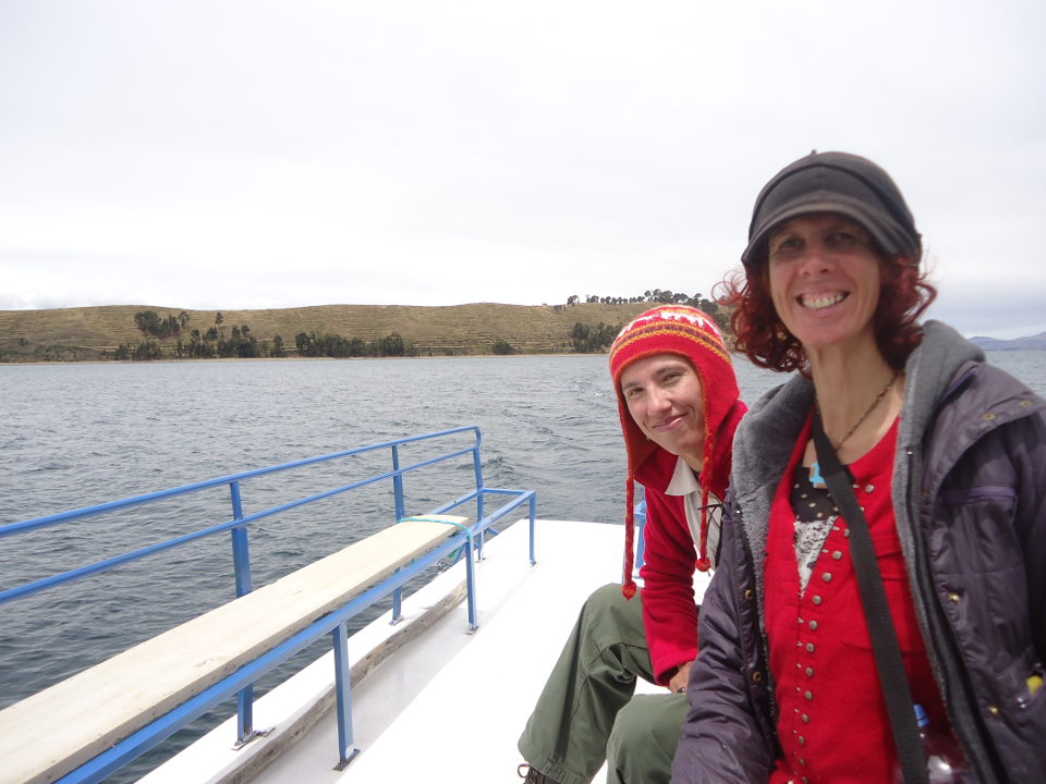 Monika and I had some lunch and then took a boat back to Copacabana. Picking up my bag at Los Andes Hotel, we decided to share a large apartment room there. It felt like a penthouse, with amazing views out of the lake. We felt happy and blessed, organising things, and I exclaimed at my extreme sunburn. We stepped out for dinner. We saw my friend, the Peruvian Jeweller. He led us into the restaurant where he works. A live band started up before us, they were great. It was funny. An opportunist older man took a shine to me. He called me his girlfriend and got me up dancing. Our dinner was lively that evening.