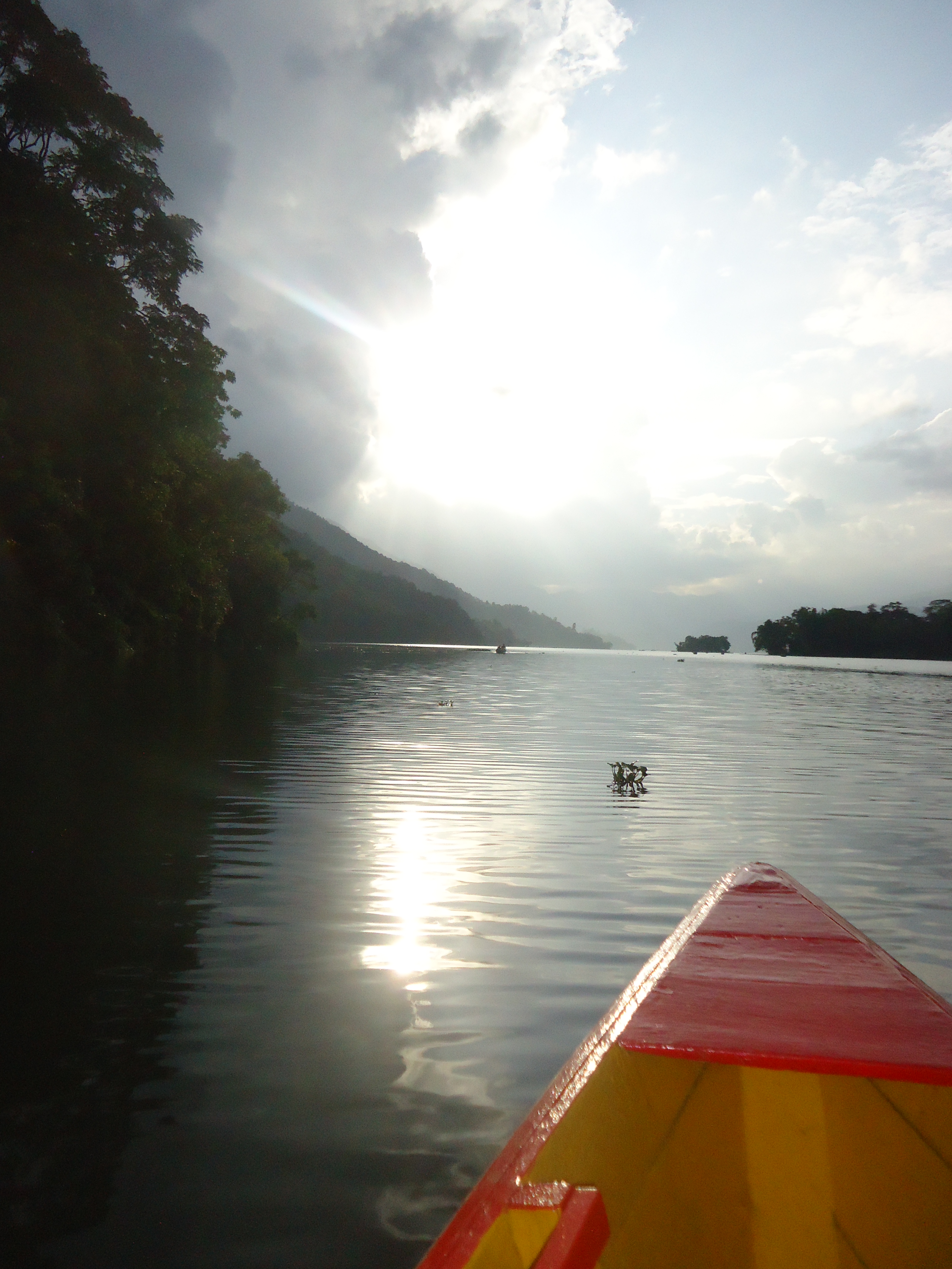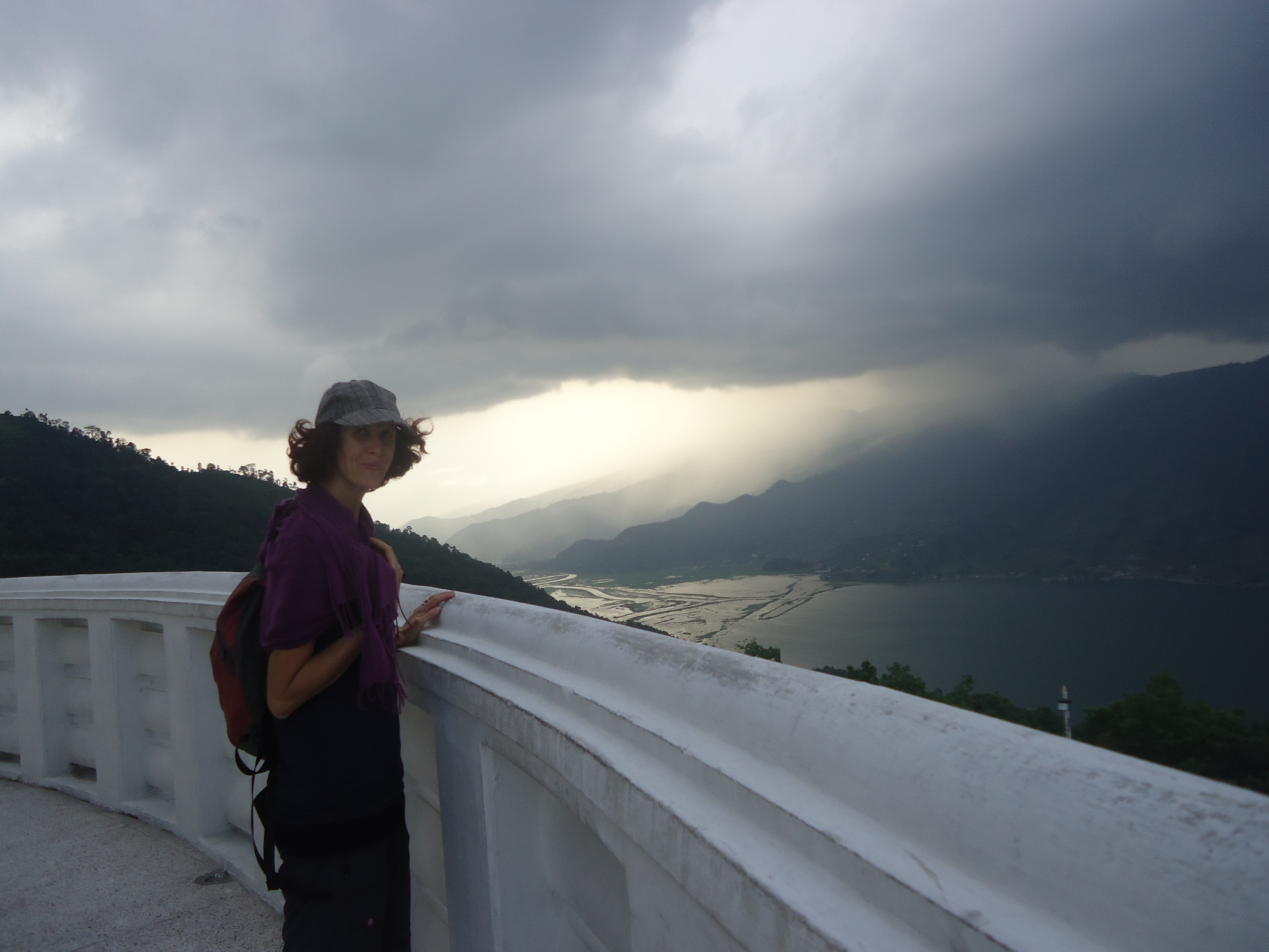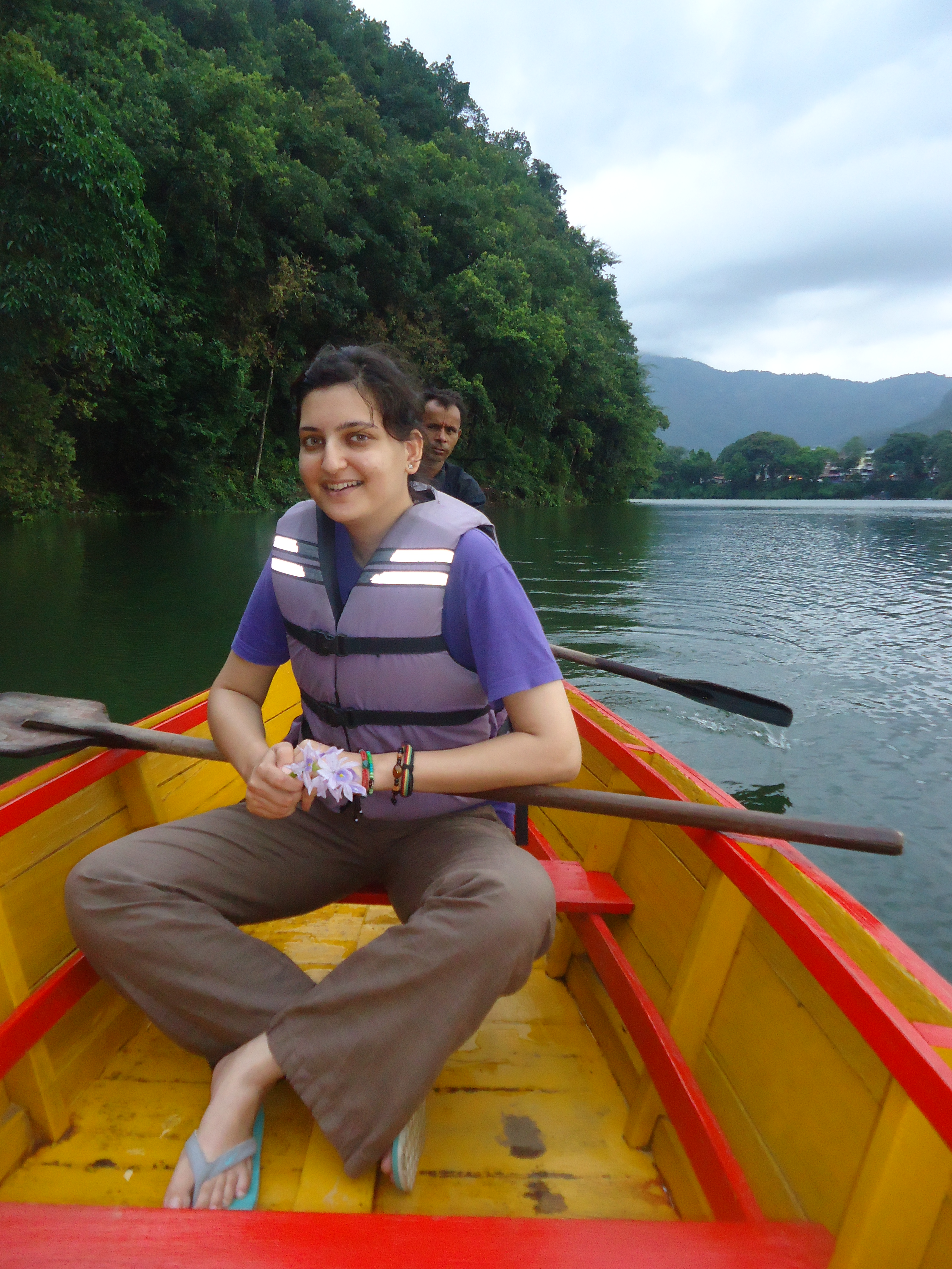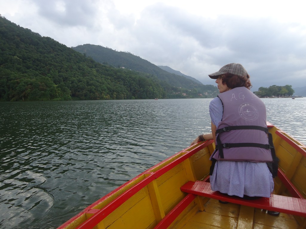 I went out on the lake with a new friend from New Delhi. Her name was Sumaiya. She was staying at the hostel with her friends, but they were away doing something else. It was a highlight of my trip to Nepal, it was 500 rupees each for 2 hours ($5 each). It was so peaceful and beautiful, the two of us in purple life jackets and being rowed. With lots of lovely birds. There was an island with a temple in the middle of the lake, Fewa Lake.