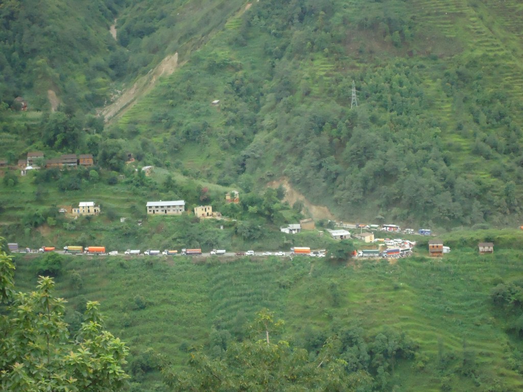 Anyways, at one stage we all piled off the bus. You could see the chain of cars. The line of cars was backed up for miles. There were armed police around. Four days before, a truck had gone into a house on the side of the road. We saw it as we went past, and the truck was still there. And the house owner was not given any apology or compensation. As a result, the people were striking and not letting traffic through. Fair enough.
