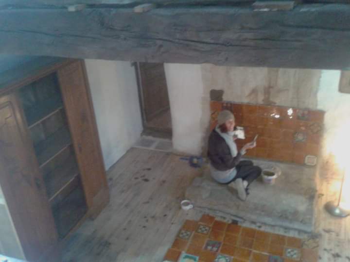 Every day was sunny and warm, except the last day when it was cold and misty. We harvested chestnuts and walnuts, cleared bracken, cut back some trees, and cleared up the spring a wee bit. The last few days I was tiling – putting in art deco tiles behind a fireplace. This was the first time I had tiled, so she was very trusting! The wall was quite uneven. We are not talking straight lines on the tiles I put in! But I enjoyed putting them up all the same.