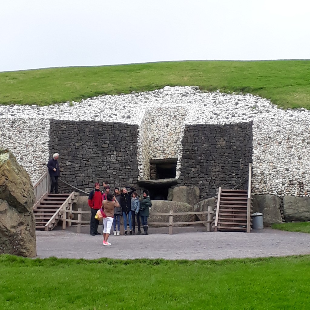 Then it was on the bus to Newgrange. Older than Stonehenge and the Great Pyramids of Giza, Newgrange was constructed about 5,200 years ago. A large circular mound, 85 m in diameter, 13.5 m high with a 19 meter stone passageway leading into a chamber with three alcoves. This passage and chamber are aligned with the mornings rising sun around the Winter Solstice. With many symbols engraved on the surrounding 97 large kerbstones.