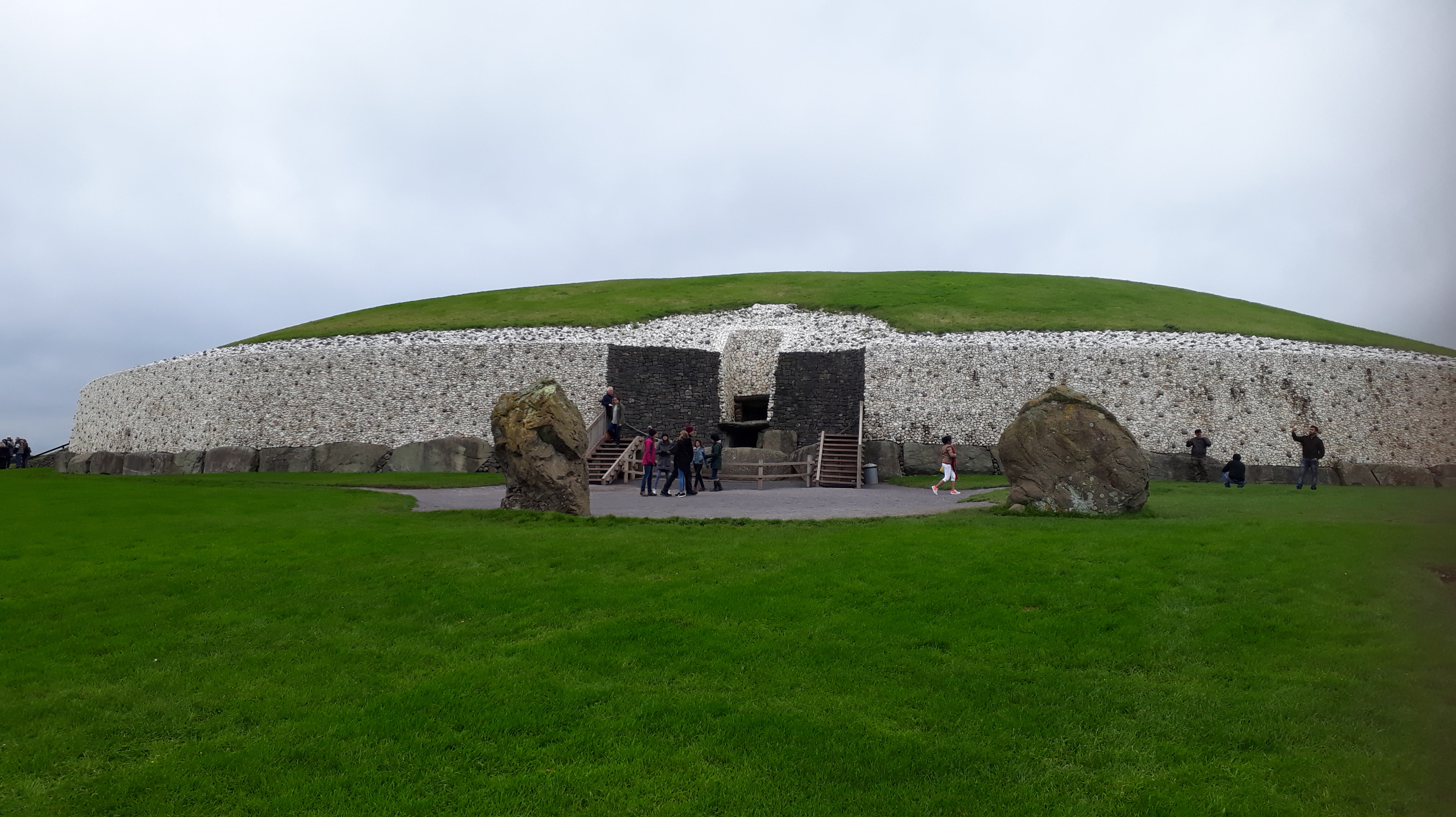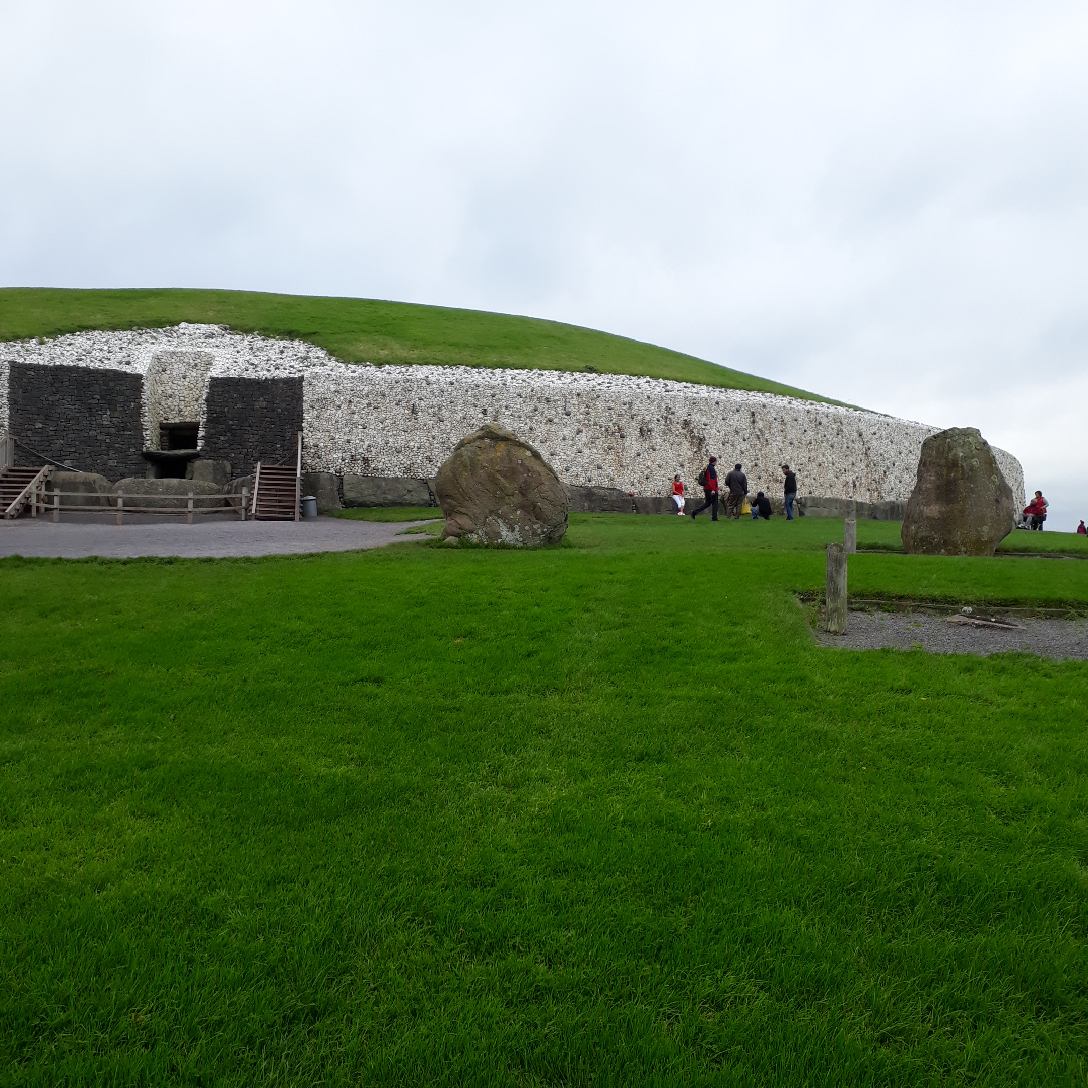 Then it was on the bus to Newgrange. Older than Stonehenge and the Great Pyramids of Giza, Newgrange was constructed about 5,200 years ago. A large circular mound, 85 m in diameter, 13.5 m high with a 19 meter stone passageway leading into a chamber with three alcoves. This passage and chamber are aligned with the mornings rising sun around the Winter Solstice. With many symbols engraved on the surrounding 97 large kerbstones.