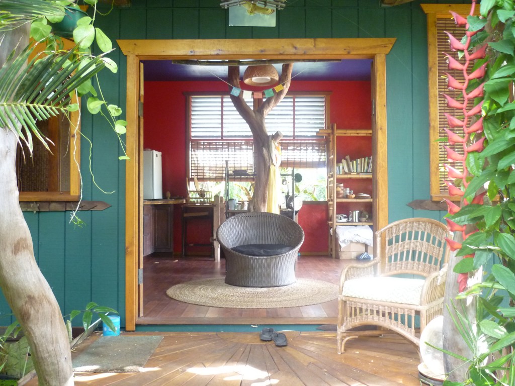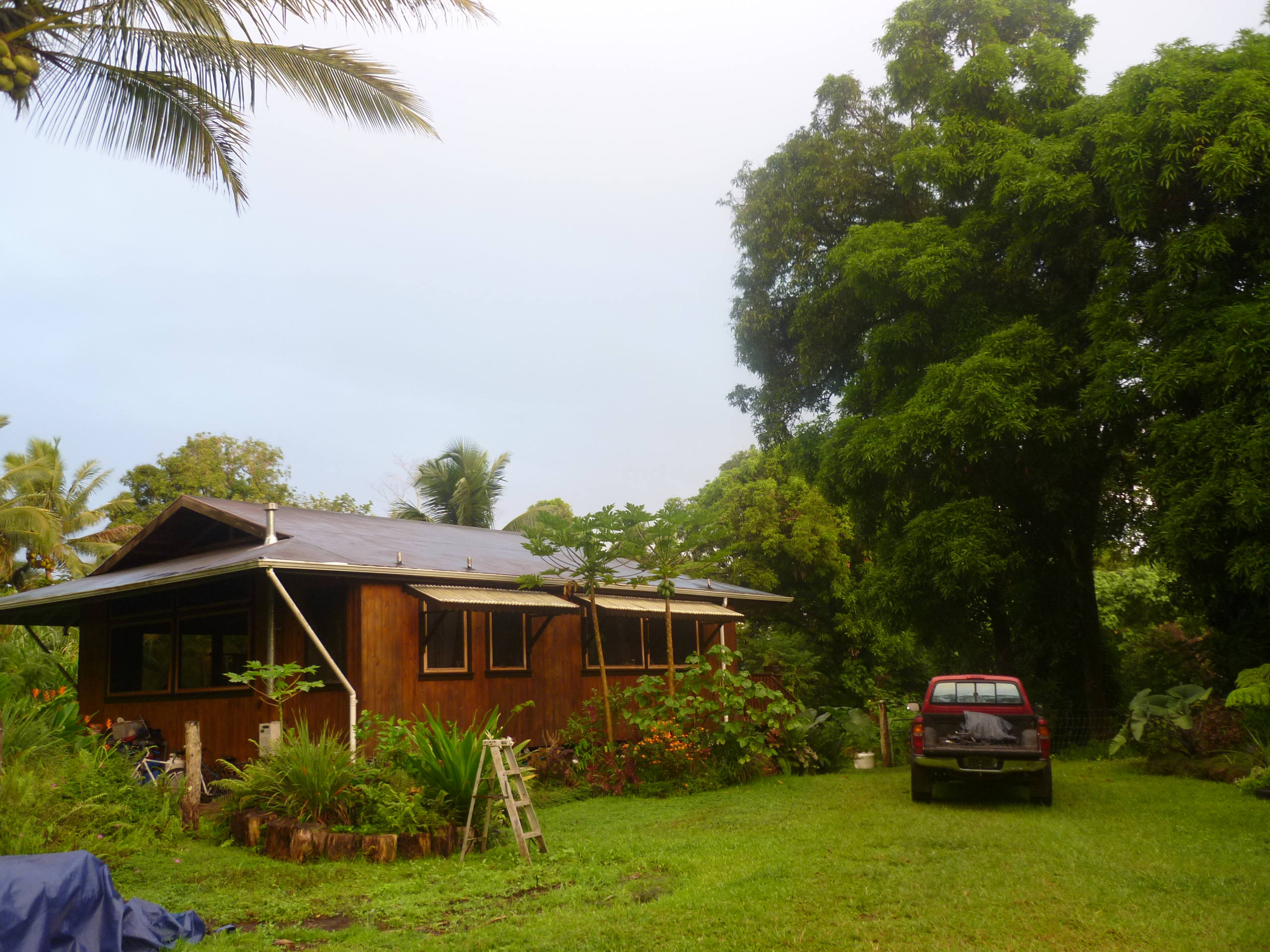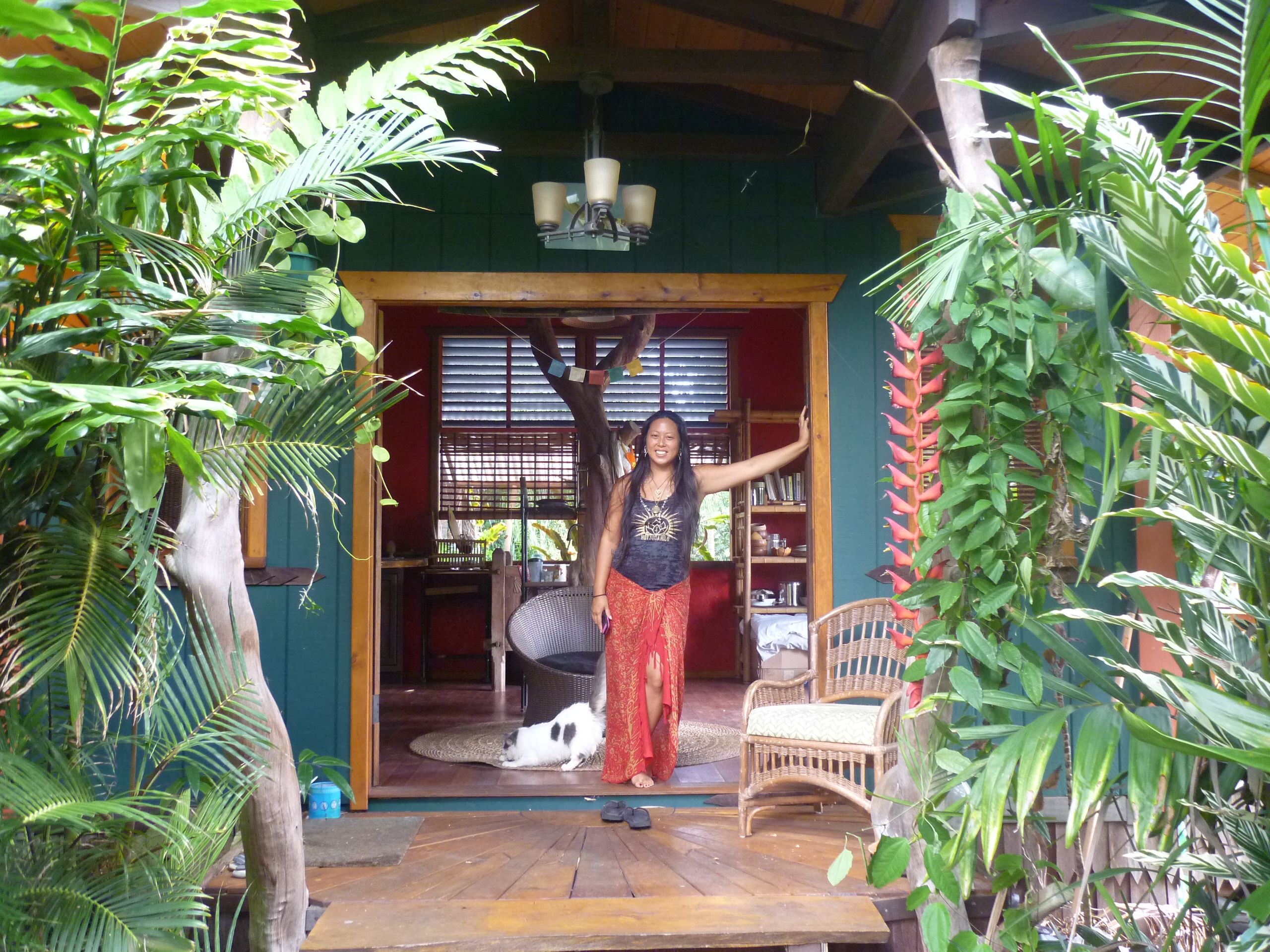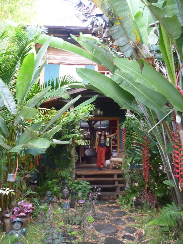 Jodie came back and we went for a swim at Anini, and then we went to her place at Moloa’a. It was an awesome place, architecturally built in a Balinese style. And the sleep out was fantastic. The beach was lovely and within walking distance. We had some delicious swims there. The stream came down the mountains and met the ocean. The weather when I was on the island was amazing, except for maybe one half rainy day. I gave Jodie a healing session, and healing massage to say thankyou. I was very appreciative of being able to stay there. On the land, there were avocado trees, papaya trees, and mango trees. They were laden with fruit, and there were banana trees as well. Amazing.