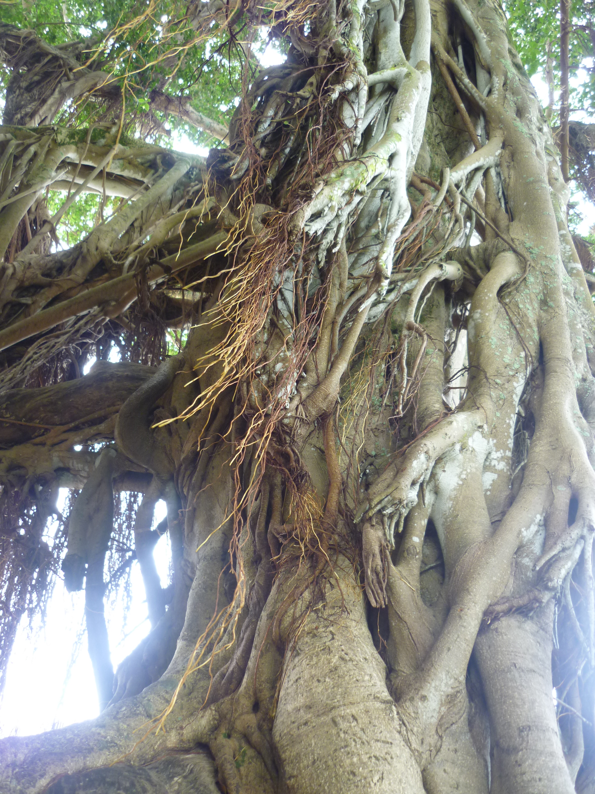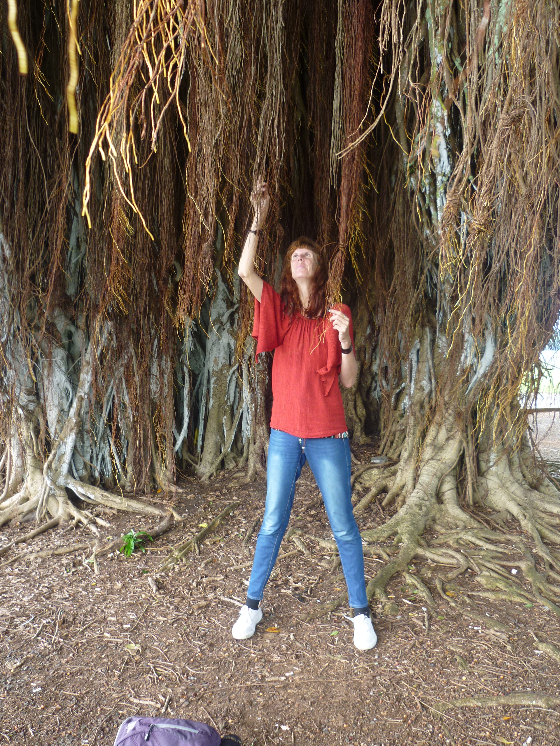 Then, Larry took Liza and I to a wondrous place in Anahola, by the river, just up from the shops. He took us to the place that a Hawaiian local man called John Pia is the guardian of. A wonderful piece of ancient land, lush with beautiful plants. Larry had worked with him there in the past. Larry left as he some things to do. John showed us the land up the back. It felt like a sacred space. The land overlooks Kalalea, the ancient sacred mountain. We sat up there and Liza, John and I talked for about four hours. It was a lovely spot we couldn’t leave. We got very much munched by mosquitoes though. He told us tales of what he had witnessed on the land. He hosts many groups who come to do retreats. There have been many gatherings, weddings, parties and ceremonies on this land. You walk down a lane by the river. On the way, you pass big ancient rocks. It’s like a gateway to enter. These rocks are something else too. Liza left her sandals there when we left, and I went back to get them.